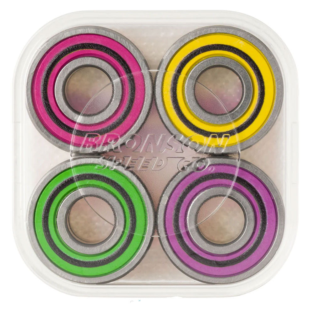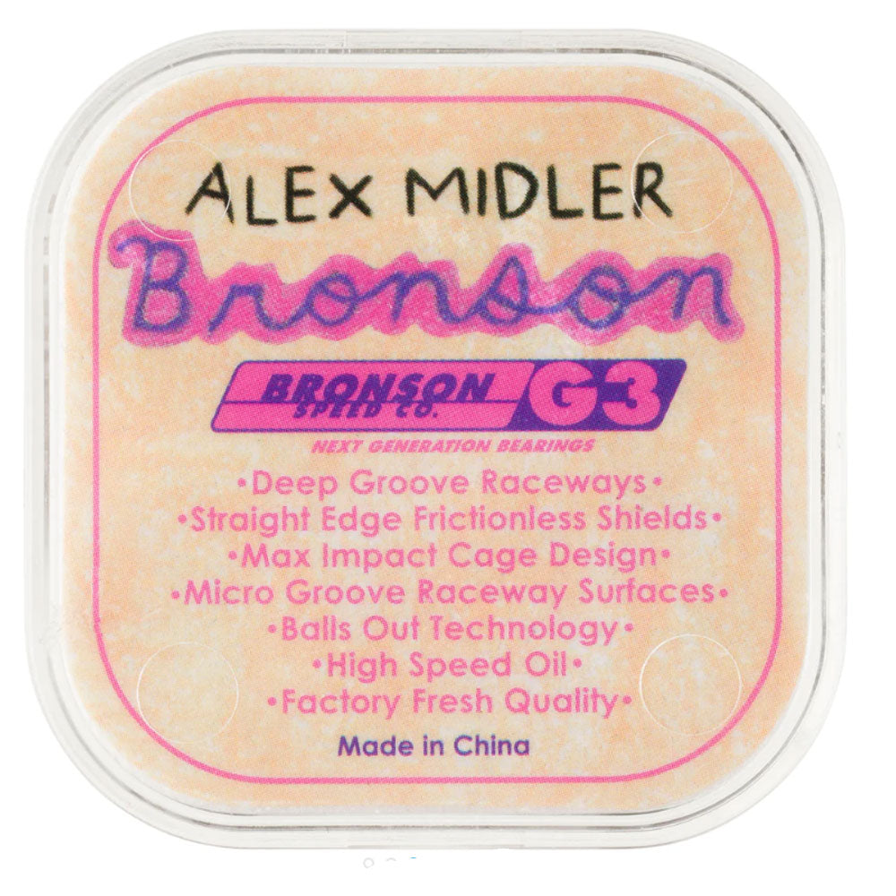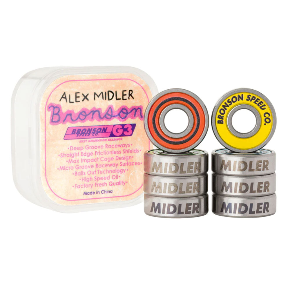 Bronson Speed Co. Skateboard Bearings Alex Midler Pro G3. Deep Groove Raceways, High Speed Ceramic Oil, Straight Edge Frictionless Shields, Max Impact Cage Design, Balls Out Technology.