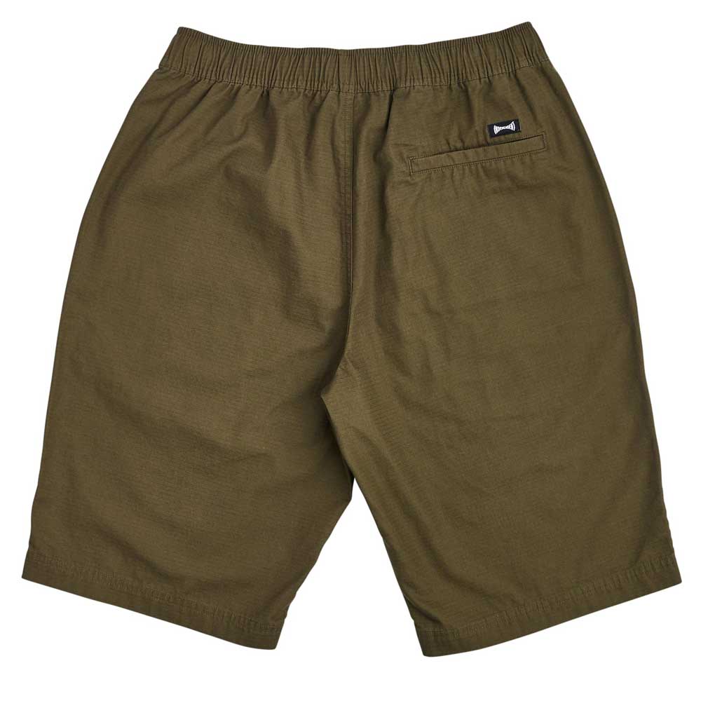 Ride the best in the latest apparel and accessories from Independent Trucks. The new Independent Span baggy fit long inseam short features flat drawcord at interior of elasticated waistband, slash pockets, Independent Span logo embroidery at front leg, and woven label at back welt pocket. Black colorway is stretch twill, Military Green is ripstop. Independent Trucks Built to Grind.